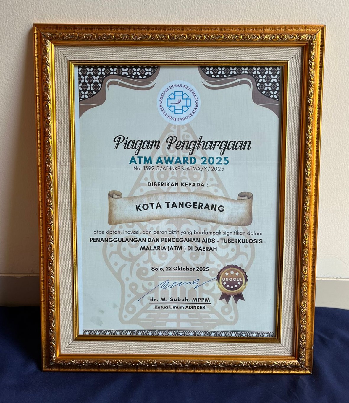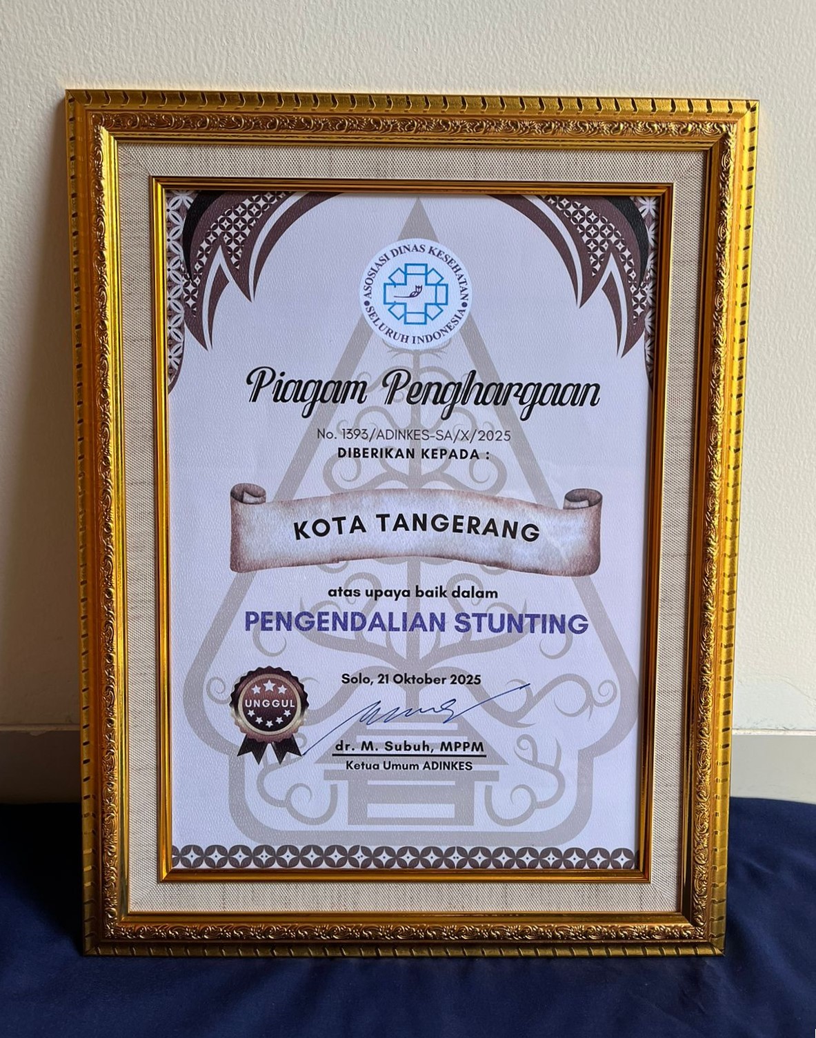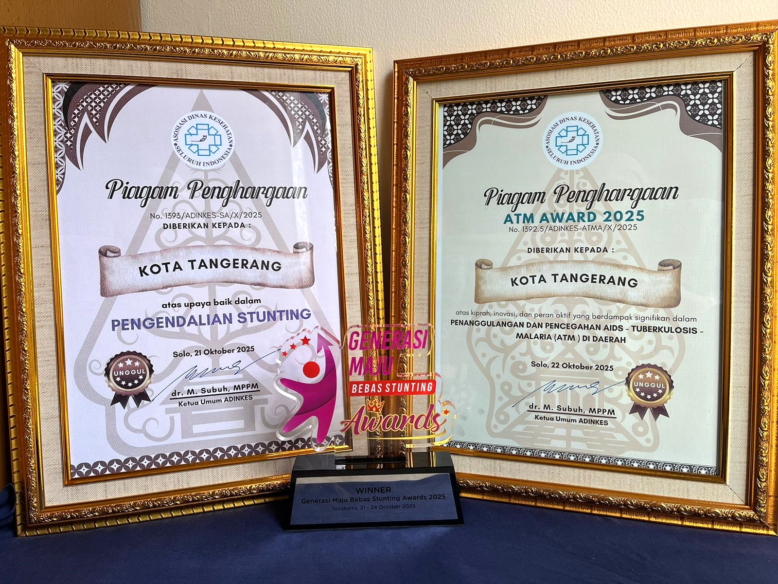 Penghargaan diserahkan langsung oleh pengurus pusat ADINKES dan diterima oleh Kepala Dinas Kesehatan Kota Tangerang, Dr. dr. Dini Anggraeni, MM. Dalam kesempatan tersebut, beliau menyampaikan rasa syukur dan apresiasi kepada seluruh jajaran Dinkes serta pihak-pihak yang telah berkolaborasi dalam mewujudkan program kesehatan masyarakat yang berkelanjutan.