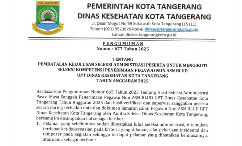 Berdasarkan surat Pengumuman Nomor 665 Tahun 2025 Tentang Hasil Seleksi Administrasi Pasca Masa Sanggah Penerimaan Non ASN BLUD UPT Dinas Kesehatan Kota Tangerang Tahun Anggaran 2025, pelamar yang sudah dinyatakan lulus seleksi administrasi, ditemukan terdapat ketidaksesuaian pada kriteria yang dilamar, sehingga terdapat pelamar yang dibatalkan kelulusannya. Untuk informasi selengkapnya, dapat di lihat pada disini.